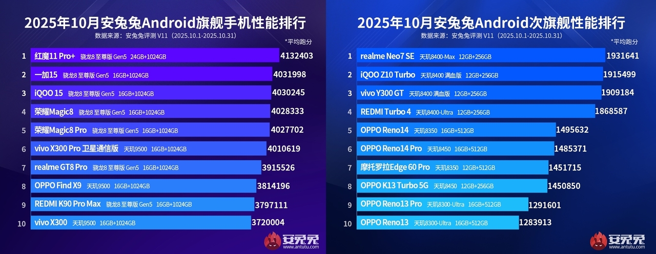 AnTuTu, Ekim 2025 dönemine ait en güçlü Android telefonların listesini açıkladı. 1-31 Ekim tarihleri arasında yapılan performans testlerinin sonuçlarına göre, amiral gemisi sınıfında Snapdragon 8 Gen 5 yonga setine sahip modeller zirvede yer aldı. Listenin lideri, 4.132.403 puanla Red Magic 11 Pro+ oldu. Cihaz, Qualcomm’un Snapdragon 8 Elite 5 Supreme Edition işlemcisiyle bu başarıya ulaştı.