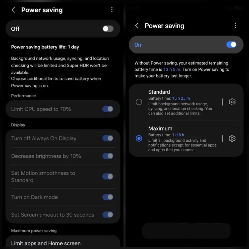 One UI 8.5 ile birlikte gelen en dikkat çekici yeniliklerden biri, güç tasarrufu için sunulan iki farklı profil oluyor. Bunlardan ilki olan “Standart Güç Tasarrufu” profili, arka planda gerçekleşen ağ kullanımı, senkronizasyon işlemleri ve konum erişimi gibi enerjiyi tüketen unsurları sınırlıyor. Kullanıcılar bu profil üzerinden çeşitli özelleştirmeler yaparak, güç tasarrufu ayarlarını kendi kullanım alışkanlıklarına göre uyarlayabiliyor.