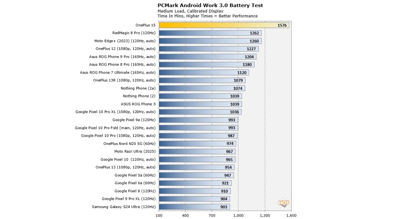 Açıklanan verilere göre OnePlus 15, PCMark 3.0 testinde tam 1.576 dakika dayanarak yaklaşık 26,2 saatlik bir kullanım süresi sundu. Bu performans, cihazın liderliği uzun süredir elinde tutan RedMagic 8 Pro’yu bile ciddi bir farkla geride bırakmasına yol açtı. RedMagic 8 Pro’nun 1.262 dakikalık süresine kıyasla OnePlus 15’in 314 dakika daha uzun dayanması, aradaki güç verimliliği farkını net şekilde gösteriyor.